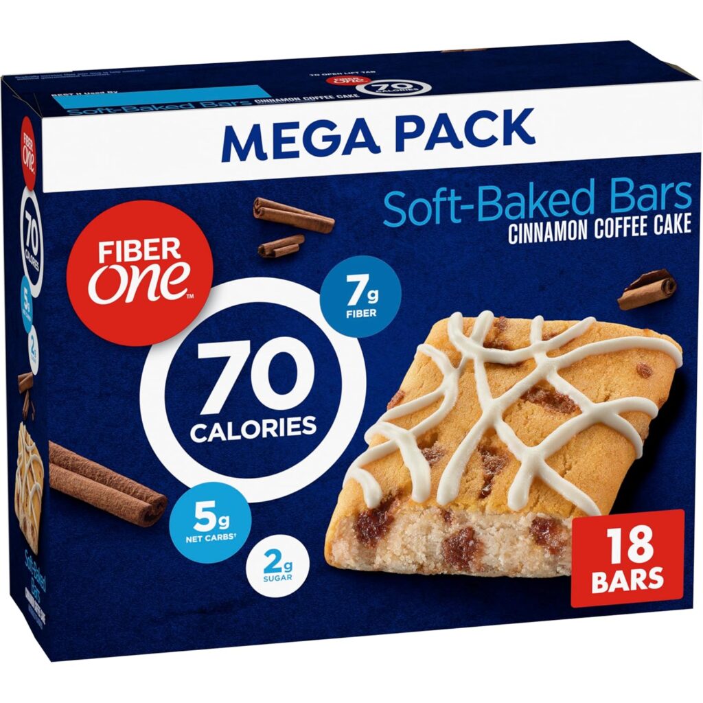 Enjoy an indulgent moment without any of the guilt with Fiber One 70 Calorie Soft-Baked Bars. These soft-baked Fiber One bars have only 70 calories and two grams of sugar for a delicious fiber bar you can feel good about eating as part of a balanced diet. A wholesome combination of low net carbs along with delicious taste so you’ll feel like one smart cookie when you say ‘yes’ to your sweet tooth. Diets high in fiber can help keep your digestive system on track. Don’t compromise on great taste when you can enjoy the irresistible taste of cinnamon coffee cake in these 70 Calorie Soft-Baked Bars. Contains 18 bars in total.