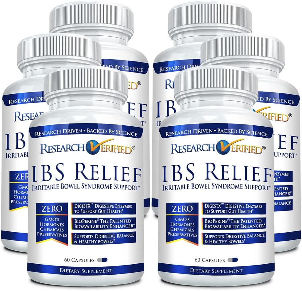 Research Verified IBS Relief – Natural Digestive Enzymes, BioPerine – 60 Capsules – Pack of 6
